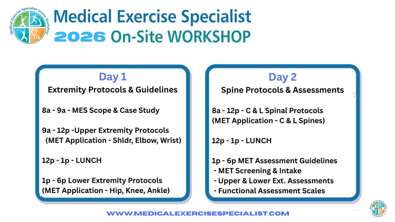 The Medical Exercise Specialist Workshop gives you the skills, systems, and credibility to manage medical clients, attract physician referrals, and grow a sustainable practice.