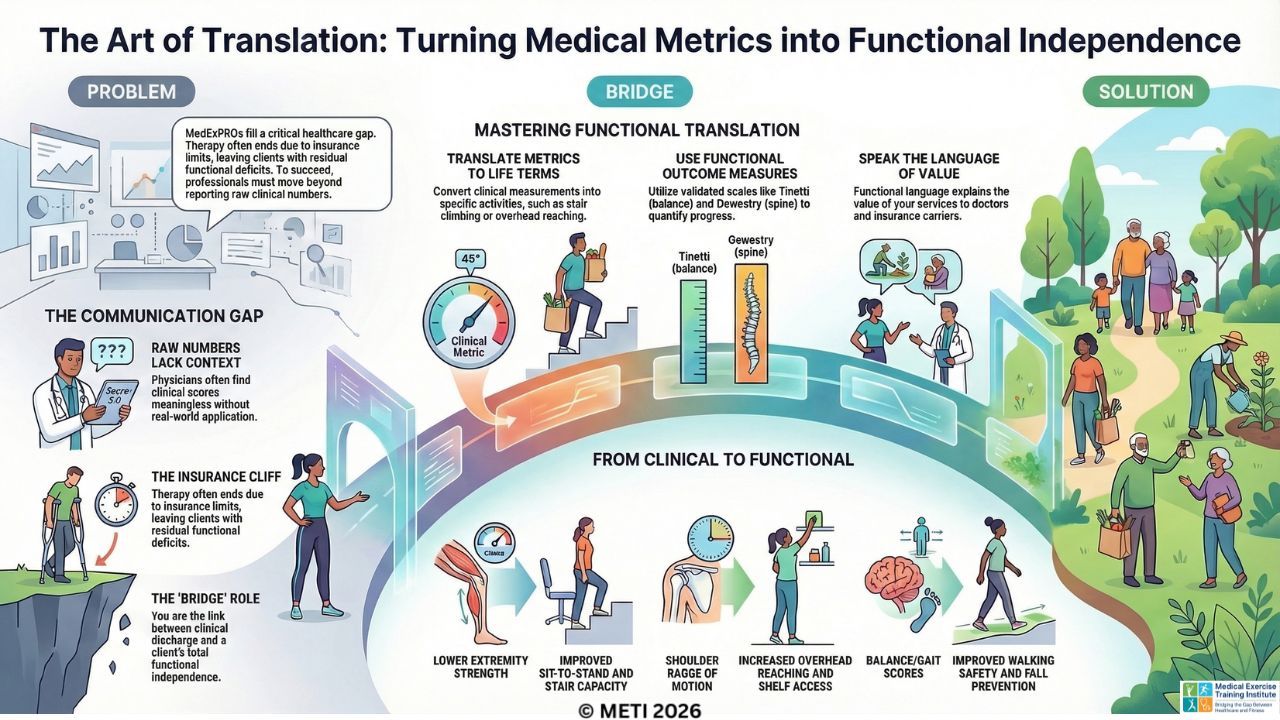 As a Medical Exercise Professional (MedExPro), you might be incredibly proud of the numbers you are generating, but numbers without real-world function completely lack context. If that physician isn't an orthopedist or a neurologist, raw data like "150 degrees of shoulder flexion" or a "3 out of 5 strength score" simply doesn't mean anything to them. They cannot translate that data into a real-life impact for their patient.