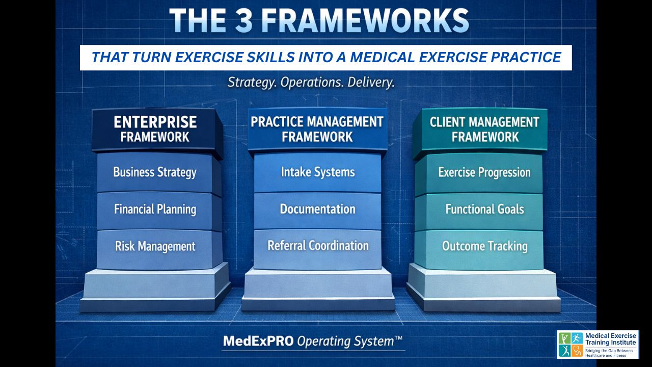 The MedExPRO Operating System introduces three interlocking frameworks that transform a technician into a practice owner. These frameworks create the guidelines required to produce consistency, measurable outcomes, and professional credibility.
